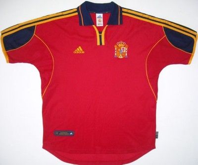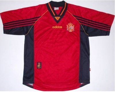 Anche nel 1998 largo spazio al blu navy sui fianchi e sotto le braccia, con le tre strisce a costeggiare gli inserti lungo le maniche. Il colletto torna a V, blu con rifiniture giallorosse e al suo interno un triangolino rosso con le iniziali della federazione spagnola: FEF.