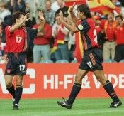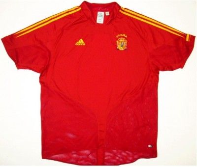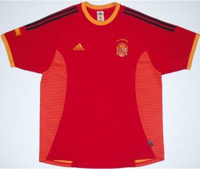 Per il mondiale del 2002, ecco a mio avviso la peggiore maglia della Spagna degli ultimi 30 anni. Colletto girocollo e bordomanica gialli. Inserti gialli lungo i fianchi, che in trasparenza risultano arancioni e le tre strisce blu navy, quasi invisibili sul rosso. Sopra lo stemma reale compare la scritta España, soluzione inedita, che resterà in voga fino al 2005.
