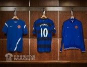 Il blu compare numerose volte nelle casacche away dello United, in particolare in quelle vittoriose del 1948 (FA Cup) e 1968 (Coppa dei Campioni). In questo caso è accompagnato da bande nere che a loro volta presentano piccole righe blu. In totale sono undici, per rappresentare i calciatori in campo. Altri particolari: la scritta “Manchester United” stampata all’interno del colletto e il diavoletto applicato sul retro.