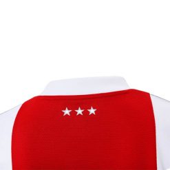 Andando quindi ad analizzare nel dettaglio la maglia di casa, possiamo trovare la classica banda centrale rossa, accompagnata ai lati dal bianco. Al fine di renderle meno evidenti, le stripes del brand sono declinate in argento e poste ai lati del colletto a girocollo, la cui larghezza riporta alla memoria le divise storiche risalenti all’epoca del calcio totale, rappresentato dal suo massimo esponente: Johan Cruyff.