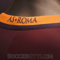 Partiamo dal colletto a forma di ‘V’ con una striscia gialla sul retro che ingloba la scritta “As Roma” in stampatello. Il corpo si distingue per un innovativo pattern più scuro a righine orizzontali che diventano più spesse scendendo verso il basso.