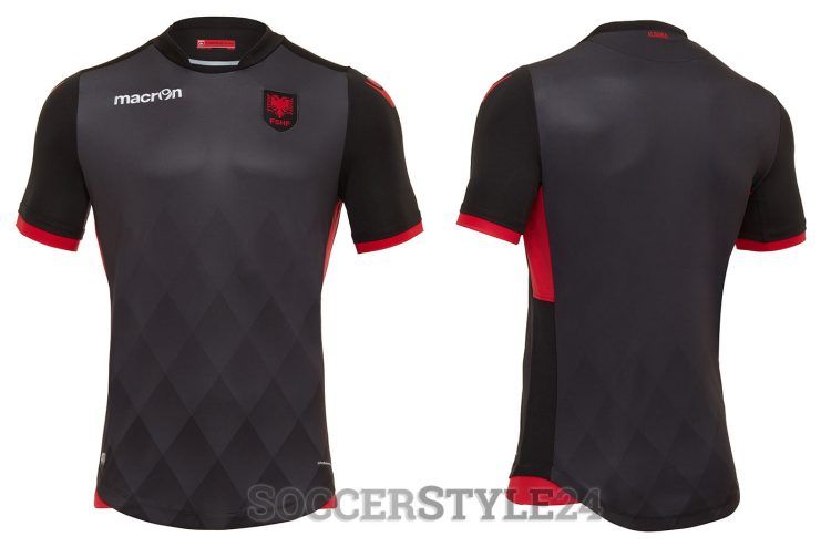 All’interno del colletto permane la frase tradizionale “Ti Shqipëri më jep nder”, mentre sul retro del collo è stampata la scritta “Albania”. Sul petto sono ricamati lo stemma della federazione albanese con l’acronimo FSHF (Federata Shqiptare e Futbollit) e il lettering Macron in bianco.
