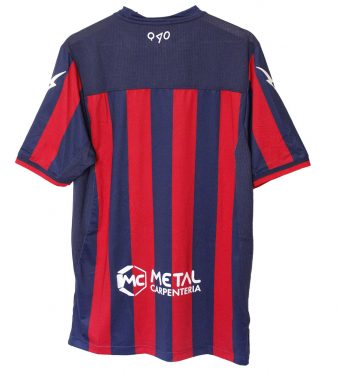 Il colletto e il pannello blu sul petto sono praticamente identici, cambia invece lo spessore delle strisce verticali che ora sono sette, di cui quattro rosse e tre blu. I loghi di Zeus, lo stemma del Crotone e l’acronimo “KRO” sul collo sono realizzati in gomma con effetto tridimensionale.