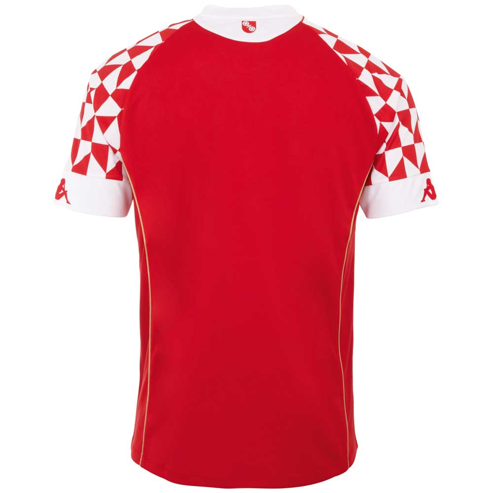 È proprio quest’ultimo il pezzo forte, difatti il disegno presente nella parte frontale della maglia riporta la ‘M’ dello stemma in una versione squadrata e con due toni di rosso differenti dividendola così a quarti asimmetrici. Grafica che viene riportata in dimensione ridotta sulle spalle e sulle maniche, questa volta abbinata al bianco per creare un bell’effetto di contrasto, facendo quindi scivolare il classico logo Kappa sull’orlo.