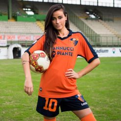 La nuova maglia casalinga si ispira a quella del 1980-1981, stagione in cui la Pistoiese disputò l’unica stagione della sua storia in Serie A. Il colore principale è ovviamente l’arancione, mentre il blu navy ricopre il colletto, la banda che scorre lungo le maniche e l’orlo di quest’ultime.