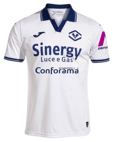Novità in casa Hellas Verona, al posto di Macron arriva Joma che propone una prima maglia con due tonalità di blu e dettagli gialli. Sulle strisce verticali tono su tono troviamo il nome dello stadio Marcantonio Bentegodi e i suoi soprannomi, un omaggio alla casa dell’Hellas che compie 60 anni.
