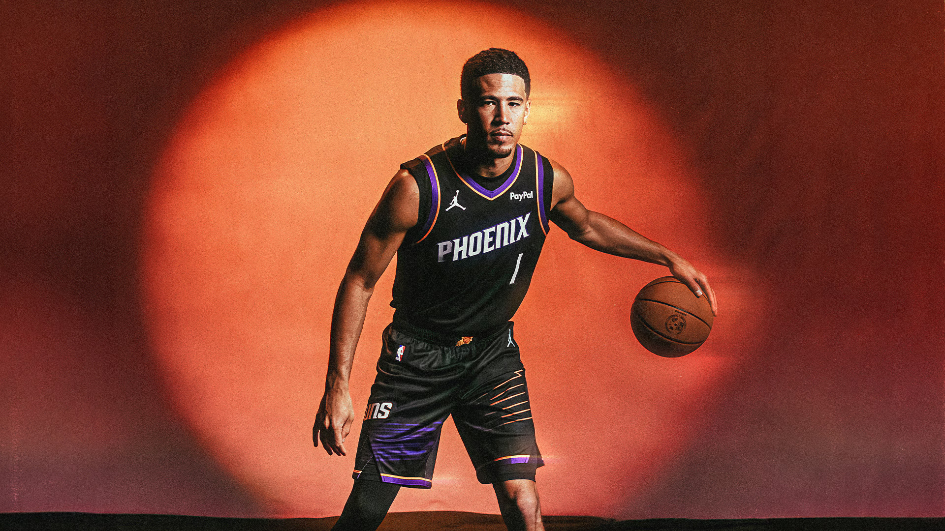 Su questa nuova divisa nera, i Suns ripropongono la scritta diagonale “PHOENIX” vista sulla maglia viola da trasferta indossata tra il 2013 e il 2017. L’iconico logo dell’esplosione solare, che domina le altre uniformi principali della squadra, trova posto solo sui pantaloncini. La scia prodotta dal pallone infuocato e i dettagli sui fianchi della maglia sono rappresentati nelle diverse sfumature che, quando il sole sorge sui deserti dell’Arizona, trasformano il viola nell’arancione, gli altri due colori sociali dei Suns. Colori che troviamo, affiancati, sulle spalline della casacca e sui bordi dei pantaloncini.