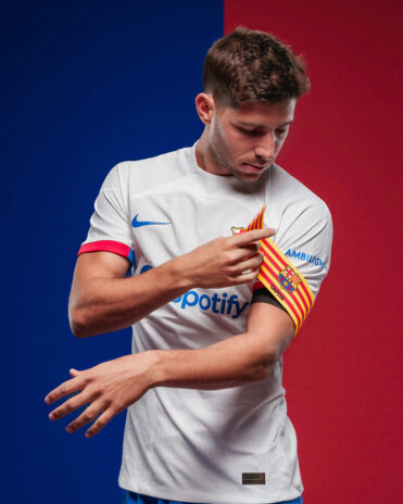 Le maniche sono rifinite dai bordi di colore rosso e blu (combinazione che si alterna da destra a sinistra), mentre i loghi degli sponsor e i nomi e i numeri sono blu. A completare il tutto c’è ovviamente la bandiera catalana, posizionata come di consueto sul retro, sotto la nuca.