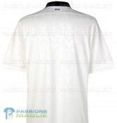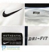 Maglia bianca con colletto a polo nero e risvolto azzurro, presenta una trama del tessuto molto particolare, con una fantasia a rombi. Swoosh a destra, stemma societario sul cuore e sul retro del colletto la parola “Inter”. Sui lati le immagini lasciano trasparire degli inserti neri.