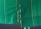 Taglio sartoriale, colletto a polo e strisce verticali di diverse tonalità di verde separate da pinstripes di colore giallo oro.