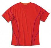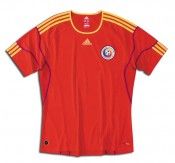 La Romania passa dal giallo al rosso per il colore della prima divisa. Presenti sulle spalle le tre strisce dell’azienda tedesca che ha posizionato il suo logo al centro. Sulla sinistra invece lo stemma della federazione romena.