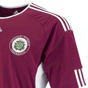 Il logo adidas è posizionato al centro, mentre lo stemma della federazione lettone è apposto sulla sinistra. Sul retro del colletto è stampata la scritta Latvija.