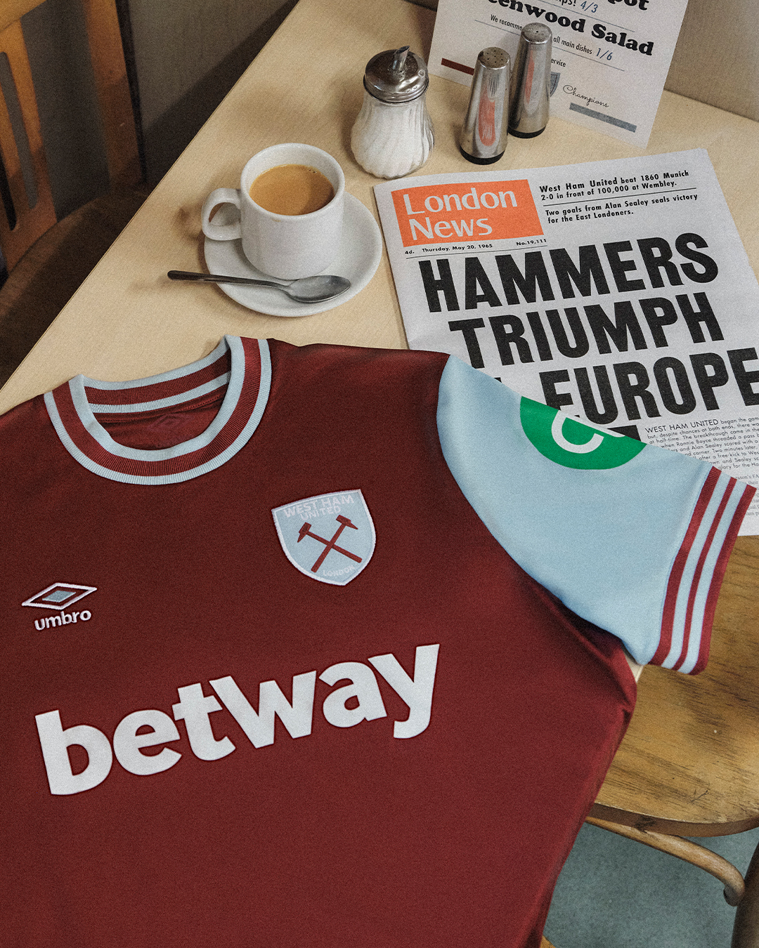 Gli scatti della presentazione si sono svolti tra le mura dell’ “E. Pellicci”, un amato caffè antico di Bethnal Green, quartiere che si trova nel cuore della comunità dell’East End di West Ham e frequentato dai tifosi. A posare per l’occasione due giocatori della prima squadra, Jarrod Bowen e il talento emergente George Earthy. Insieme a loro anche elementi legati alla squadra come la figlia del leggendario capitano, Roberta Moore.